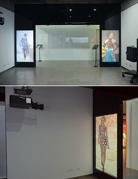 櫥窗影像方案,日立展示了傳統(tǒng)方式豎向投射和新技術(shù)豎向投射的對比,新型豎向轉(zhuǎn)換鏡頭可以在水平放置投影機時投影豎直畫面,這一創(chuàng)新適用于商場、機站、車站。