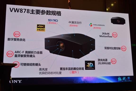 2018年9月14日, 在廣州國際音響唱片展盛大開幕之日, 索尼正式向中國市場重磅發(fā)布一款家用投影機(jī)新品 – 激光4K HDR家庭影院投影機(jī)VPL-VW878。新機(jī)結(jié)合了先進(jìn)的激光光源與索尼的4K SXRD面板技術(shù),配備多種新功能,將進(jìn)一步提升用戶的沉浸式觀感。