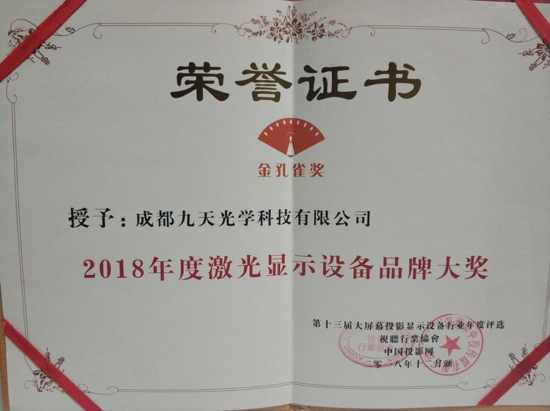 “激光顯示設(shè)備評選活動(dòng)”作為業(yè)內(nèi)權(quán)威的活動(dòng)之一,評選長達(dá)70天,經(jīng)由廠家自薦、業(yè)界精英、行業(yè)媒體投票、專家學(xué)者評審等環(huán)節(jié),參考指標(biāo)囊產(chǎn)品研發(fā)實(shí)力、行業(yè)知名度、市場占有率、用戶滿意度等多項(xiàng),綜合評定后誕生終選名單,而這無疑是對獲獎(jiǎng)企業(yè)品牌綜合實(shí)力的最高肯定。九天光學(xué)以豐富的激光投影光機(jī)產(chǎn)品線、自主研發(fā)能力、核心專利、優(yōu)秀的技術(shù)解決方案,獲得“2018年度激光顯示設(shè)備大獎(jiǎng)”。
