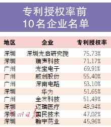 威創(chuàng)在“專利授權(quán)率”中排名第4。專利授權(quán)率可以在一定程度上反映專利申請的質(zhì)量,在榜單收錄專利授權(quán)率前10的企業(yè)中均為深圳或廣州的企業(yè)(機構(gòu)),反映深圳、廣州兩地企業(yè)(機構(gòu))的創(chuàng)新水平在廣東省處于領(lǐng)先地位。