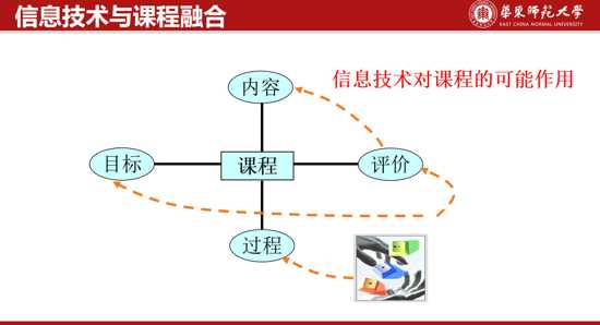 概括的來說可以用這個圖,該能力由課程所涉內(nèi)容,培養(yǎng)教學(xué)的目標(biāo)、教學(xué)的過程以及教學(xué)的評價組成。在信息技術(shù)整合與學(xué)科教學(xué)推進(jìn)的過程當(dāng)中,我們還必須要利用信息技術(shù)支持內(nèi)容的準(zhǔn)備,去支持在我們現(xiàn)在的環(huán)境當(dāng)中去開展教學(xué)的過程,以及對學(xué)生的進(jìn)行過程性以及結(jié)構(gòu)性的評價。