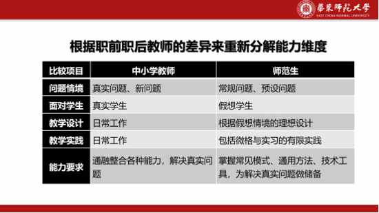 所以在培養(yǎng)我們師范生技術(shù)應(yīng)用能力的時候,要考慮到我們的發(fā)展起點,這個邏輯起點,跟在職的信息技術(shù)應(yīng)用能力培養(yǎng)是有差異的。我這里面列舉了一些差異,中小學(xué)教師和師范生當(dāng)中的問題情景有比較大的差異,面對的學(xué)生、教學(xué)設(shè)計、教學(xué)實踐、要達(dá)到能力要求都是有比較大的差距,需要依據(jù)差異設(shè)計我們師范生技術(shù)的整合能力培養(yǎng)規(guī)劃。