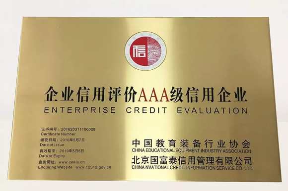 2018年10月,國家權(quán)威部門對銳取在企業(yè)信譽(yù)、產(chǎn)品品質(zhì)、用戶服務(wù)各方面表示了充分的肯定,予以2018年教育裝備行業(yè)企業(yè)信用等級評價(jià)復(fù)審?fù)ㄟ^,再次正式被授予企業(yè)信用等級“aaa”級最高信用等級榮譽(yù)證書。