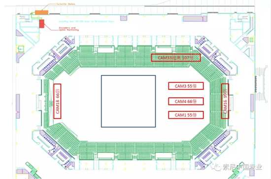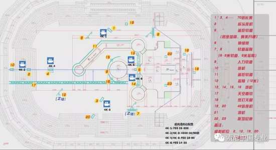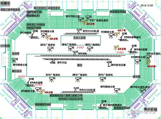 4k制作系統(tǒng)中的1、2、3、4、5號機位分別與高清系統(tǒng)的1、2、3、4、15機位并排放。舞臺主面3臺107倍大倍率鏡頭外加1個廣角作為主機位,我們在體育轉播尤其是足球轉播中,主機位的1、2、3號機的鏡頭可以占整個體育轉播畫面的百分之八九十以上,反觀這次跨年的4k制作,雖與體育轉播不同,但是在有限條件下,這樣的機位布局也依然能保證一場完整的4k跨年制作。