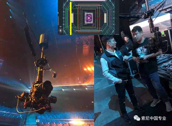 另一方面在舞臺上方,架設一條橫貫舞臺的天軌,同時布置一套蜘蛛系統(tǒng),機位運動方向與天軌垂直。最后,再加上兩臺活動的斯坦尼康,對舞臺做到了一個全方位立體的覆蓋。