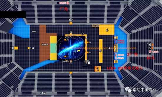 跨年的節(jié)目組與技術團隊為強化跨年轉播效果,在金光綜藝館的三樓,也就是整個場館的最高觀眾席位增加了一個29號大全景機位。在直播過程中,本機位的攝像老師就可以給到一些歌曲開場的大全景機位,同時也會模擬搖臂,給到一些有一定翻轉角度的全景畫面。