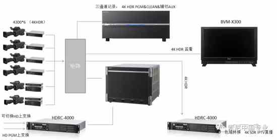 本次江蘇衛(wèi)視跨年演唱會4k制作采用6臺sony hdc-4300,同時為滿足iptv 4k sdr直播的需要,將兩路高清信號進行上變換,一路為可切換的高清信號(導播可根據(jù)自己鏡頭切換的需要選取上變換機位),另一路為高清pgm上變換。兩路高清上變換都經(jīng)過sony hdrc-4000交叉變換器,上變?yōu)?k hdr信號。