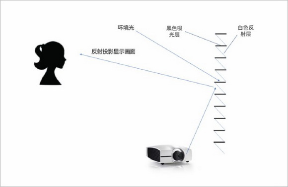 激光投影抗光幕示意圖如圖所示,抗光幕微結(jié)構(gòu)為鋸齒狀的光學(xué)結(jié)構(gòu),鋸齒結(jié)構(gòu)上方為涂覆黑色材料的吸光層,下方為涂覆特殊材料的白色反光層。黑色層可以吸收環(huán)境光,提高對(duì)比度,白色反光層用于投影時(shí)反射圖像。從抗光幕的微結(jié)構(gòu)可以發(fā)現(xiàn),幕布無法實(shí)現(xiàn)全部黑色,還有相當(dāng)一部分白色,導(dǎo)致幕布的對(duì)比度不高,無法實(shí)現(xiàn)高品質(zhì)的畫面顯示。