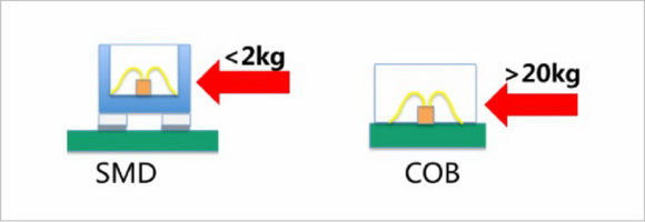 SMD LED小間距顯示技術(shù)用于100英寸以上電視機(jī),有兩個(gè)難以逾越的技術(shù)障礙,使得這種技術(shù)難以成為100英寸以上電視采用的技術(shù)。一個(gè)技術(shù)障礙是LED燈珠防撞能力差,像素可靠性低。用SMD 1010器件制作的LED小間距顯示屏,其推力比COB顯示屏的推力小了一個(gè)數(shù)量級(jí),導(dǎo)致其可靠性低,特別是在P1.0以下點(diǎn)間距的低可靠性,基本無法實(shí)現(xiàn)量產(chǎn)。