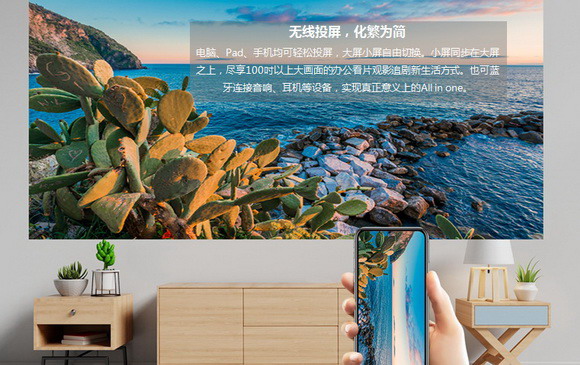 電腦、Pad、手機(jī)均可輕松投屏,大屏小屏自由切換。小屏同步在大屏之上,盡享100吋以上大畫面的辦公看片觀影追劇新生活方式。也可藍(lán)牙連接音響、耳機(jī)等設(shè)備,實(shí)現(xiàn)真正意義上的All in one。