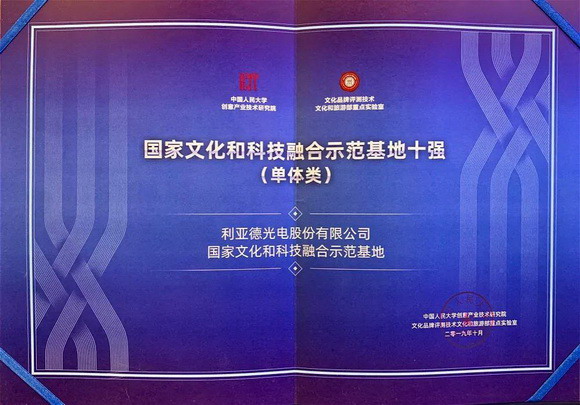 2019年10月25日,中國人民大學(xué)創(chuàng)意產(chǎn)業(yè)技術(shù)研究院、文化品牌評測技術(shù)文化和旅游部重點(diǎn)實(shí)驗(yàn)室在2019中國(南京)文化和科技融合成果展覽交易會(huì)上發(fā)布了“國家文化和科技融合示范基地十強(qiáng)榜單”。此次,利亞德光電股份有限公司成功入圍單體類基地十強(qiáng)并排名榜首,成為業(yè)界典范。