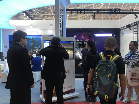 來(lái)到VR超感學(xué)習(xí)角體驗(yàn)區(qū),看到不少觀眾在排隊(duì)體驗(yàn)。體驗(yàn)者頭戴VR眼鏡,站在一人高的全景顯示區(qū)前互動(dòng)學(xué)習(xí)。VR超感學(xué)習(xí)角內(nèi)置VR安全教育、VR紅色教育、VR自然地理景觀等科普內(nèi)容,而且集VR全景展示、VR教育教學(xué)展示、信息發(fā)布展示于一體的多功能展示體驗(yàn)產(chǎn)品,為使用者提供輕沉浸、高度交互的整體解決方案。