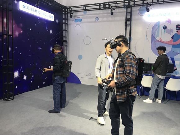 再來(lái)看全沉浸互動(dòng)式高教實(shí)訓(xùn)方案體驗(yàn)區(qū),體驗(yàn)者戴著VR眼鏡,手握手柄在空中比劃,看起來(lái)在玩游戲,實(shí)際上在體驗(yàn)消防實(shí)訓(xùn)課。體驗(yàn)者玩得不亦樂(lè)乎,圍觀群眾個(gè)個(gè)躍躍欲試。