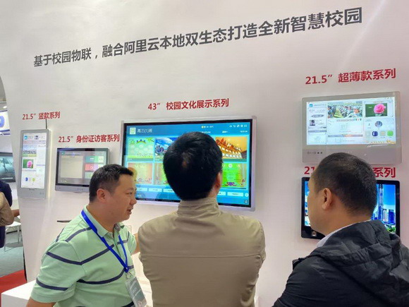 方案,也是本次展會的亮點之一。刷卡拍照、人臉識別、指紋考勤、智能門禁等多種新款式的班牌,完全實現(xiàn)了校園的自動化,大大提高了學校教學和管理的效率。