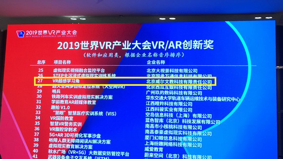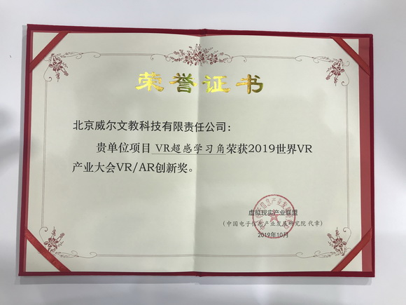 “VR讓世界更精彩——VR+5G 開啟感知新時(shí)代”—2019世界VR產(chǎn)業(yè)大會(huì)在江西南昌拉開帷幕。國(guó)務(wù)院副總理劉鶴及江西省相關(guān)領(lǐng)導(dǎo)人出席大會(huì)。威爾文教攜VR超感系列方案及產(chǎn)品精彩亮相,并獲得2019 VR/AR年度創(chuàng)新獎(jiǎng)。