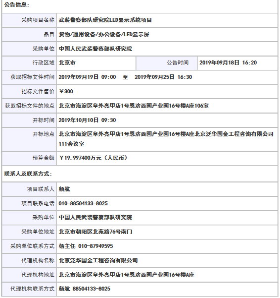 采購項目名稱: 武裝警察部隊研究院LED顯示系統(tǒng)項目