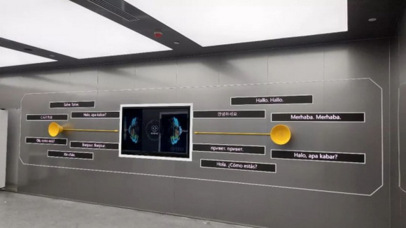 騰訊展廳內(nèi)AI同聲互譯大放異彩,創(chuàng)意條形屏設(shè)計用以顯示全球十二國不同語言,搭承騰訊語言翻譯系統(tǒng),讓所有參觀者體驗同聲傳譯交流的快感,讓溝通無國界、交流無障礙,用獨特的展現(xiàn)形式將騰訊翻譯君產(chǎn)品特性更直觀呈現(xiàn)。