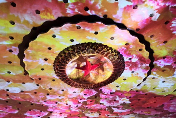 隨著舞蹈歌聲表達(dá)情緒的層層遞進(jìn),大會(huì)堂穹頂上,變幻投映著繽紛十色的光影圖案,生動(dòng)地呈現(xiàn)出萬里長征、艱苦抗戰(zhàn)、發(fā)展生產(chǎn)、建設(shè)家園等歷史場(chǎng)景,將演出氣氛一步一步推向高潮。