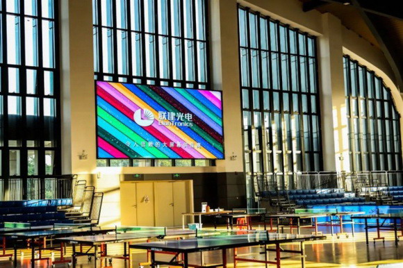 在操場(chǎng)一側(cè)室內(nèi)籃球場(chǎng)內(nèi),由聯(lián)建光電為此空間獨(dú)家打造的兩幅高清電子信息屏立于左右兩側(cè),用作比賽實(shí)時(shí)播放比分及慢動(dòng)作回放等信息,在夕陽(yáng)的映射下,盡顯當(dāng)代校園獨(dú)特的文化特色。