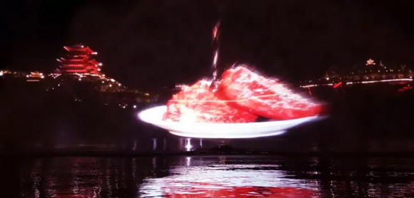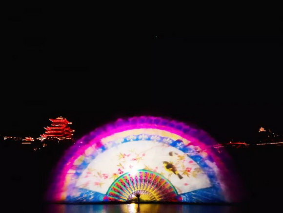 表演通過(guò)智能控制,將裸眼3D視頻、音樂(lè)、互動(dòng)與燈光等完美結(jié)合,融合在一河兩岸的山水間,融合在七峰疊翠棧橋、凝翠閣的景色里,流光交錯(cuò)、璀璨唯美,為虬城的夜晚勾勒出一幅幅絢麗多姿的畫(huà)卷。