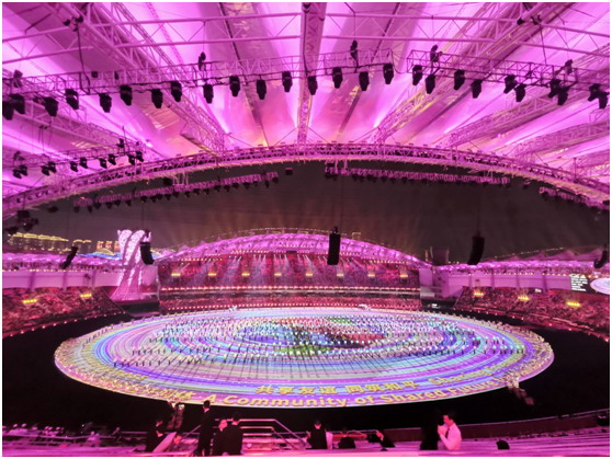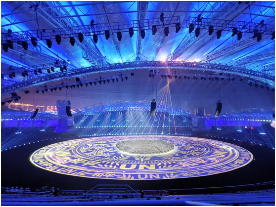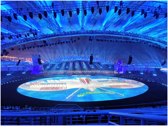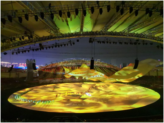 這是一次和平的慶典,更是所有軍人的榮耀。軍運(yùn)會組委會用了最高標(biāo)準(zhǔn)籌備本場盛會。開幕式采用了國內(nèi)首創(chuàng),也是世界上最大的全三維立體式舞臺。充分利用有限空間,通過高新技術(shù)實(shí)現(xiàn)舞臺的多維擴(kuò)展,F(xiàn)場大面積使用了投影技術(shù),通過多媒體影像互動,完成了360度全景式、立體式空間表演。