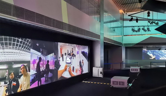 進入藝術(shù)空間,首先與參觀者見面的是2019動態(tài)影像藝術(shù)空間制作集錦展區(qū),參觀者可以通過四個分屏縱覽整個藝術(shù)空間的策劃及布展過程,了解各個展項背后的故事。雙通道融合配合先進的圖形處理、畫面渲染技術(shù),帶來卓越的畫面體驗。