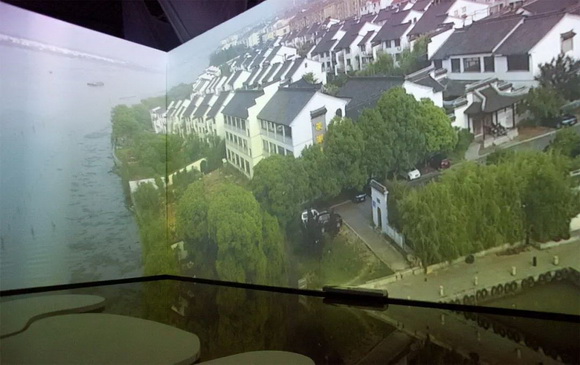由三臺攝影機同時拍攝的影像,經(jīng)由多通道邊緣融合,在三折幕上重新融合成一個完整的畫面,真實地還原了拍攝時的人眼視角。未到水鄉(xiāng),已身在水鄉(xiāng)。