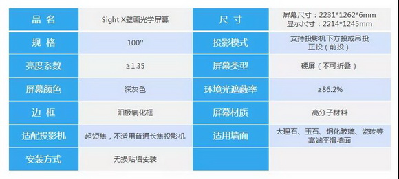 Sight X壁畫光學(xué)屏幕參數(shù)表