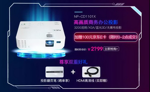 作為絕對主力機型CD1101X,3200流明的高亮度一直是商務辦公人群的優(yōu)選產(chǎn)品。登錄NEC京東自營官方旗艦店購機可享2399超低特惠價,限時可附贈100元京東E卡,下單即贈HDMI高清線,另外曬單還可獲得投影翻頁筆。