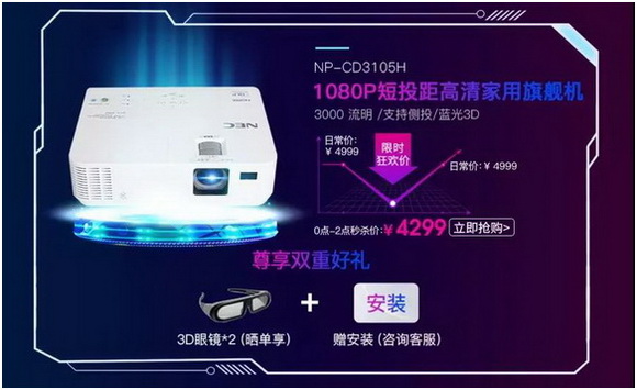 11月11日0點至2點,超值限時秒殺活動將在NEC京東自營官方旗艦店正式開啟。擁有3000流明高亮度、全高清1080P 的NEC CD3105H鉅惠直降400元,限時搶購只要4299元,另可尊享雙重好禮,曬單可獲得兩幅3D眼鏡,還可享受免費安裝,裝機不再求人。
