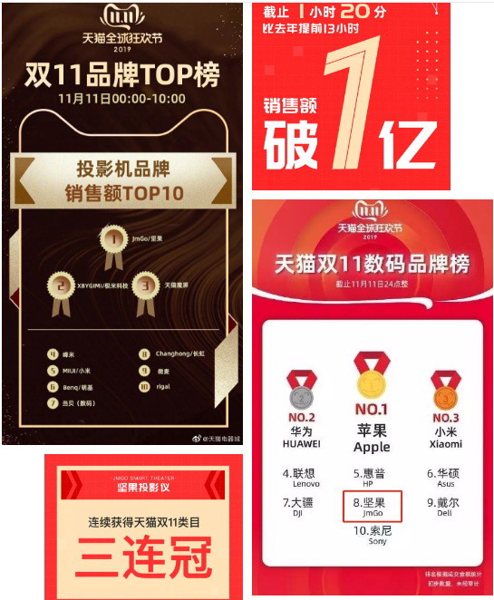 截止2019年11月11日23點59分,堅果投影儀狂攬6項冠軍,遠超同行,穩(wěn)居第一!