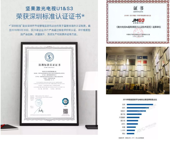 前段時間堅果旗下激光電視產(chǎn)品更是獲得了“深圳標準認證證書”,高于普通國家標準。