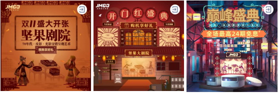 同時本次雙11旗艦店視覺“以國為潮”,結(jié)合三個年代,從一塊屏幕的發(fā)展作為切入點,打造皮影—劇院—未來投影的故事線作為彩蛋放在了雙11的主視覺中,完美還原三個時期的特色。
