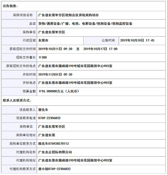 采購項目名稱: 廣東省東莞軍分區(qū)視頻會議系統(tǒng)采購項目