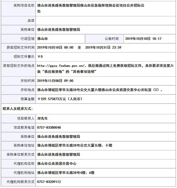 采購(gòu)項(xiàng)目名稱: 佛山市政務(wù)服務(wù)數(shù)據(jù)管理局佛山市應(yīng)急指揮視頻會(huì)議項(xiàng)目公開招標(biāo)公告