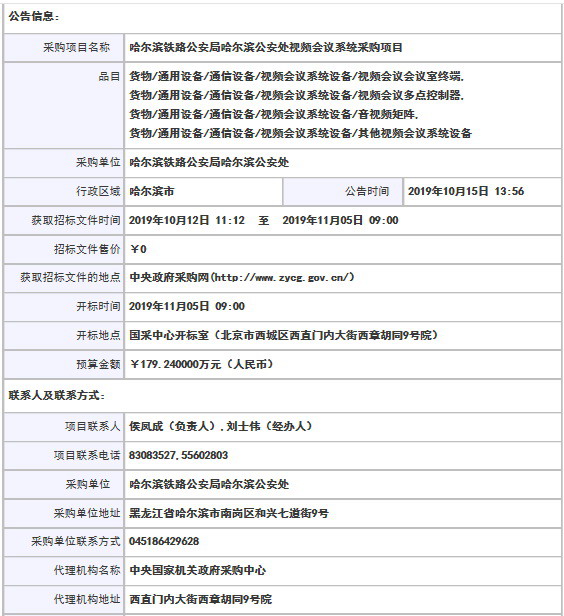 采購(gòu)項(xiàng)目名稱(chēng): 哈爾濱鐵路公安局哈爾濱公安處視頻會(huì)議系統(tǒng)采購(gòu)項(xiàng)目
