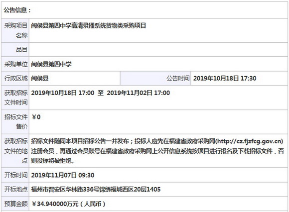 采購項目名稱: 閩侯縣第四中學高清錄播系統(tǒng)貨物類采購項目