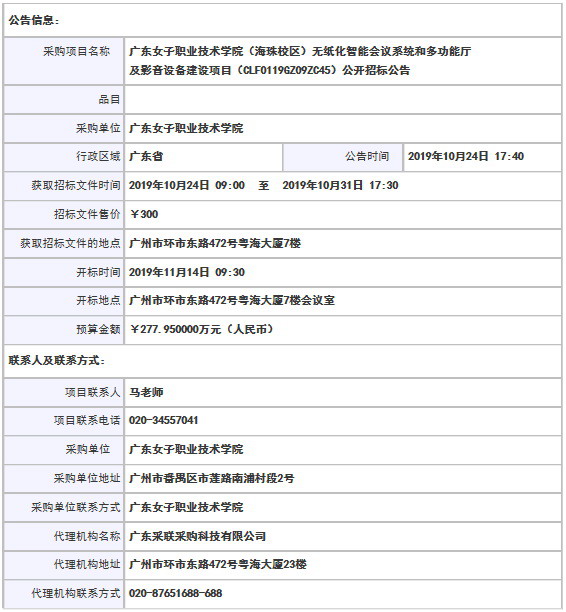 采購(gòu)項(xiàng)目名稱: 廣東女子職業(yè)技術(shù)學(xué)院(海珠校區(qū))無(wú)紙化智能會(huì)議系統(tǒng)和多功能廳及影音設(shè)備建設(shè)項(xiàng)目(CLF0119GZ09ZC45)公開(kāi)招標(biāo)公告
