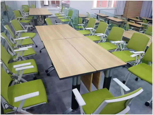 傳統(tǒng)階梯教室桌椅固定,學生分組困難,小組討論階梯教室打破一階一排格局,將兩層階梯合并為一層,學生們既可以分成兩排聽課,也可合并成大桌進行小組討論,還可通過newline會議平板輔助學習。