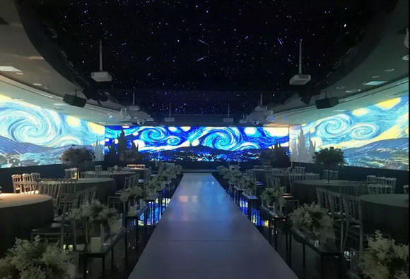 上;摞惿峋褪钱(dāng)下最熱門的沉浸式婚禮會(huì)館的代表之一。當(dāng)賓客步入會(huì)場,一覽270°全視角梵高星空環(huán)幕,畫面變幻更顯星空神秘。