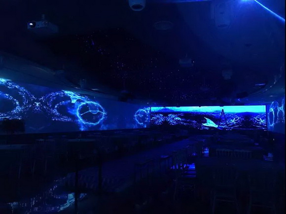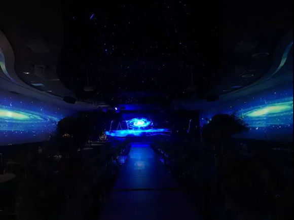 無論是梵高油畫下的星空,還是逼真的浩瀚宇宙,都是通過17臺(tái)NEC CF6600U高端商務(wù)投影機(jī)融合實(shí)現(xiàn)的動(dòng)態(tài)投影效果,再結(jié)合歐式穹頂花樣作為呼應(yīng),從而達(dá)到“舟行碧波上,人在畫中游”的靜謐之境。