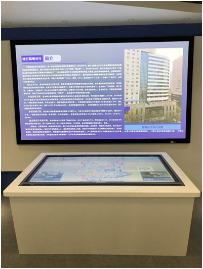 這個區(qū)域詳細介紹了中國建設銀行云南省總行現(xiàn)狀,一臺65英寸newline會議平板成為信息檢索中心,通過點擊屏幕,點選銀行的各個部門系統(tǒng)或業(yè)務構(gòu)成,相關(guān)的文字與視頻內(nèi)容馬上就會出現(xiàn)在眼前,讓嘉賓們輕松獲悉中國建設銀行的業(yè)務優(yōu)勢與特色。