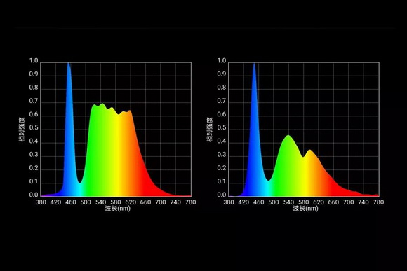 而從橫坐標(biāo)我們可以讀出藍(lán)光的波長(zhǎng),從而判斷它對(duì)人眼的危害大小。從上面的光譜圖中我們可以看到,激光電視的藍(lán)光波長(zhǎng)更接近460nm,這可以顯著減少藍(lán)光危害。