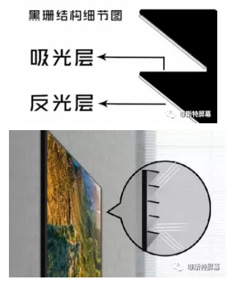 先來(lái)說(shuō)說(shuō)黑柵幕。在黑柵幕的表面,橫向上布滿了細(xì)小的棱鏡結(jié)構(gòu),主要作用是:吸收不反射來(lái)自屏幕上方的光線,主要反射來(lái)自屏幕下方的光線來(lái)抗環(huán)境光。不過(guò),黑柵幕的橫向結(jié)構(gòu)只能抵擋來(lái)自屏幕上方的光線,如果屏幕兩側(cè)和正面有光源照射屏幕的話,黑柵幕的抗光效果會(huì)大打折扣。當(dāng)然,如果是夜晚開(kāi)頂燈觀看有較好的效果。