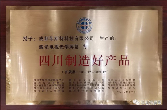經(jīng)過層層篩選,菲斯特產(chǎn)品“激光電視光學(xué)屏幕”被評(píng)為“四川制造好產(chǎn)品”。評(píng)選委員會(huì)在入選評(píng)語中寫道:“企業(yè)技術(shù)創(chuàng)新能力強(qiáng),產(chǎn)品生產(chǎn)質(zhì)量管理體系健全,工藝成熟,整體技術(shù)性能達(dá)到國內(nèi)同類產(chǎn)品領(lǐng)先水平。在超短焦激光電視光學(xué)屏幕方面技術(shù)指標(biāo)處于國內(nèi)領(lǐng)先水平,對(duì)推動(dòng)激光電視產(chǎn)業(yè)發(fā)展具有重要作用,活動(dòng)評(píng)委會(huì)認(rèn)定菲斯特“激光電視光學(xué)屏幕”為四川制造好產(chǎn)品!