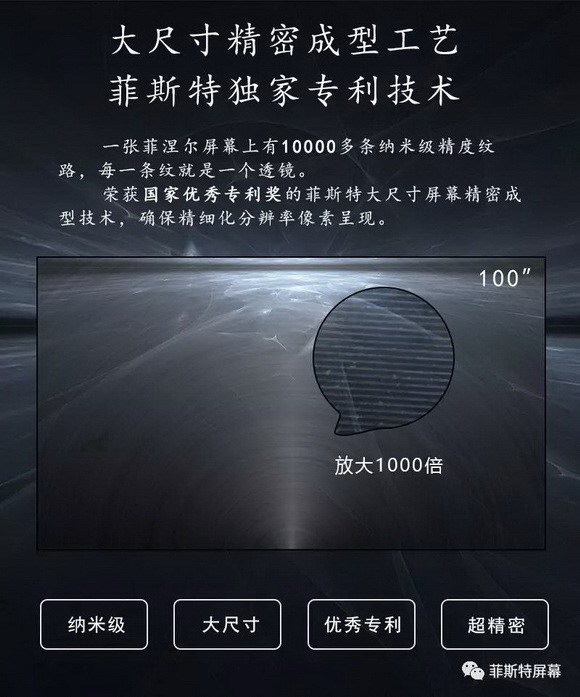 菲斯特獨(dú)家專利技術(shù)的8層光學(xué)結(jié)構(gòu),榮獲中國優(yōu)秀專利獎(jiǎng)的納米級(jí)超精密加工技術(shù),比發(fā)絲還細(xì)膩的光學(xué)紋路,幕面平整如鏡,無懼環(huán)境光干擾,完美呈現(xiàn)精細(xì)分辨率。
