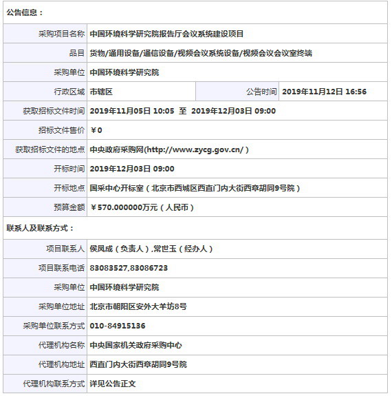 采購(gòu)項(xiàng)目名稱(chēng): 中國(guó)環(huán)境科學(xué)研究院報(bào)告廳會(huì)議系統(tǒng)建設(shè)項(xiàng)目采購(gòu)品目: 貨物/通用設(shè)備/通信設(shè)備/視頻會(huì)議系統(tǒng)設(shè)備/視頻會(huì)議會(huì)議室終端預(yù)算金額: ¥570.000000萬(wàn)元(人民幣) 獲取招標(biāo)文件時(shí)間: 2019年11月05日 10:05 至 2019年12月03日 09:00 獲取招標(biāo)文件地點(diǎn): 中央政府采購(gòu)網(wǎng)(http://www.zycg.gov.cn/)