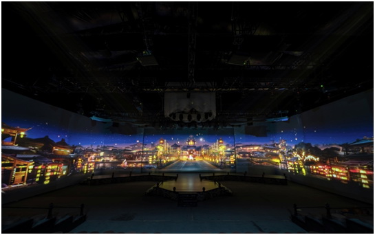 工程投影機(jī)的配合下,一幅可看可聽的敦煌畫卷徐徐展開,觀眾們可以隨著劇情發(fā)展,一邊聆聽裊裊的敦煌古樂,欣賞婀娜的敦煌舞蹈,一邊領(lǐng)略傳承千年敦煌藝術(shù)的無窮魅力。