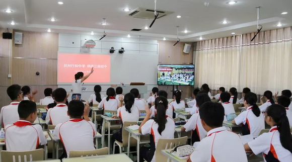 △桐廬縣江南初中與杭州行知中學(xué)異地同上一課