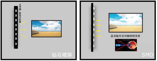 Viamax(緯而視科技)鉆石硬屏專用光學(xué)覆膜讓LED顯示屏發(fā)光更加均勻,使發(fā)光像素近似“面光源”,有效降低光強(qiáng)輻射,消除摩爾紋、炫光及刺目對(duì)觀看者視網(wǎng)膜的傷害,使人眼能夠近距離、長(zhǎng)時(shí)間觀看,不易產(chǎn)生視覺(jué)疲勞及心理抗拒。有效抵抗藍(lán)光傷害。